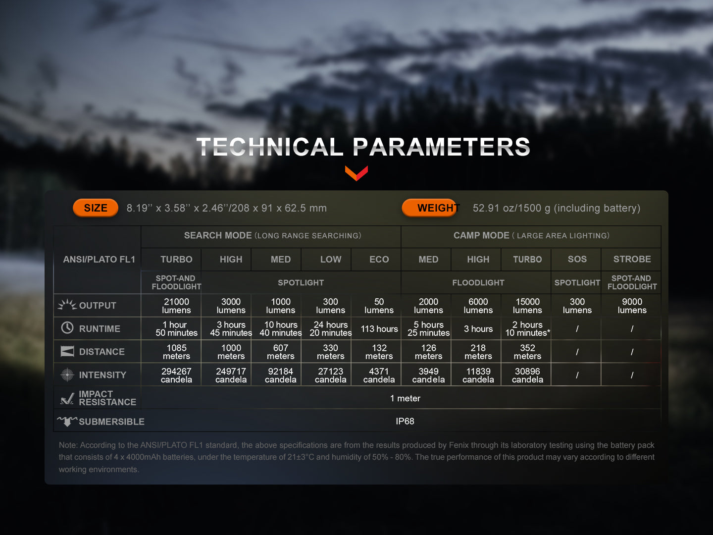 - Lighting Modes: 10 modes including 4 spotlight levels, 3 floodlight levels, 1 combo mode, strobe, and SOS