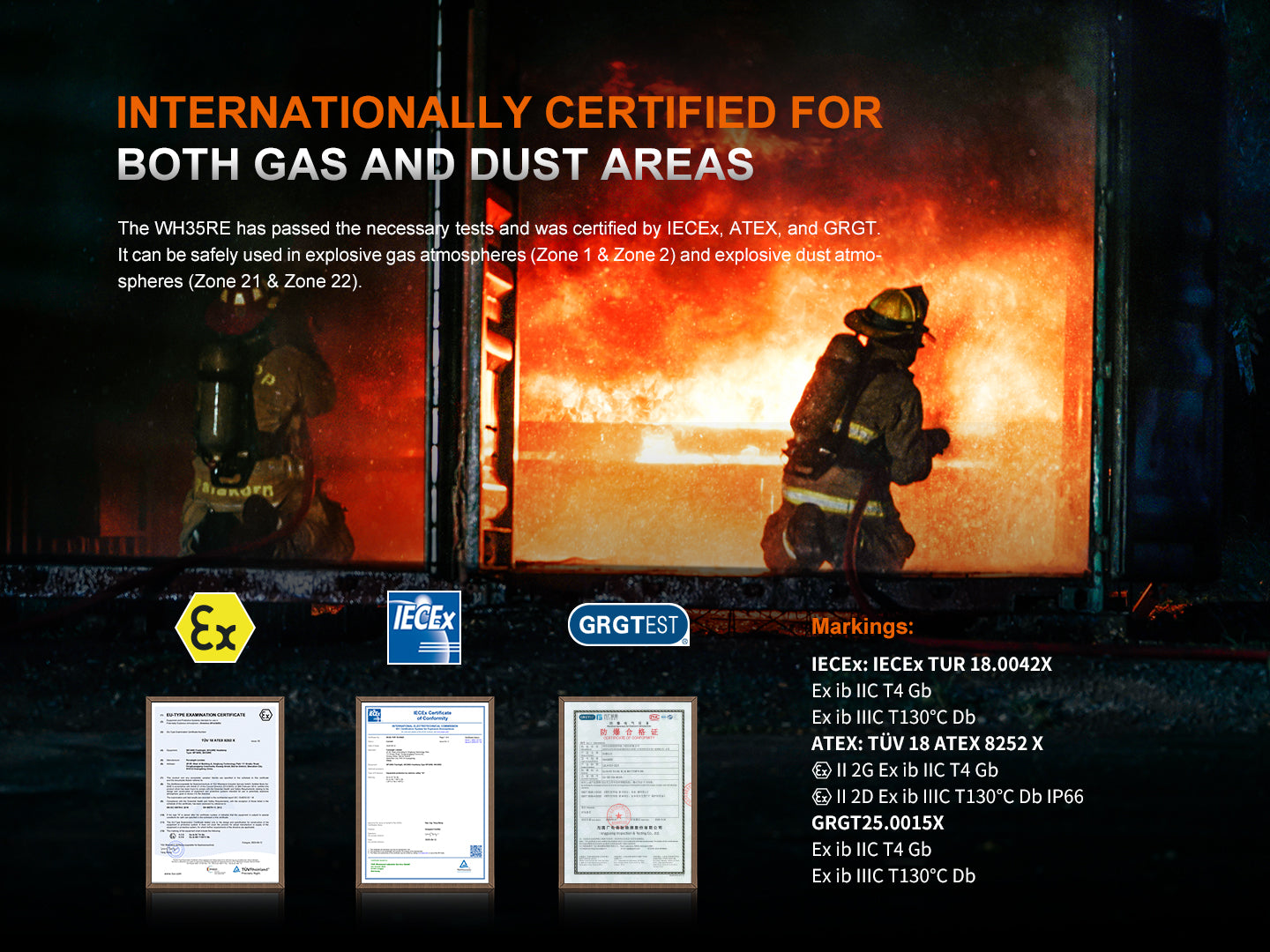 Therefore, this product is safe to use in explosive atmospheres classified as Zone 1 and Zone 2, as well as in combustible dust areas classified as Zone 21 and Zone 22. This includes environments such as petroleum, chemical, and textile industries, firefighting, metallurgical areas, power stations, and paper plants, etc.