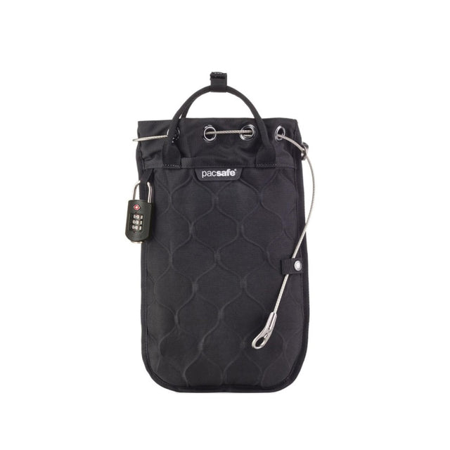 - Cut-resistant anchor strap locks around a fixed object to protect your bag